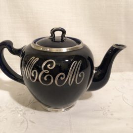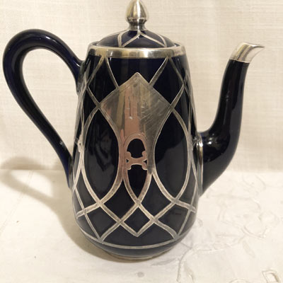 We have a wonderful selection of Lenox silver overlay porcelain with either a cream or cobalt background. We have tea and coffee sets,sugar and creamers and tea caddies. All of these silver overlay items are from 1900 to 1930s, and they are very hard to find.