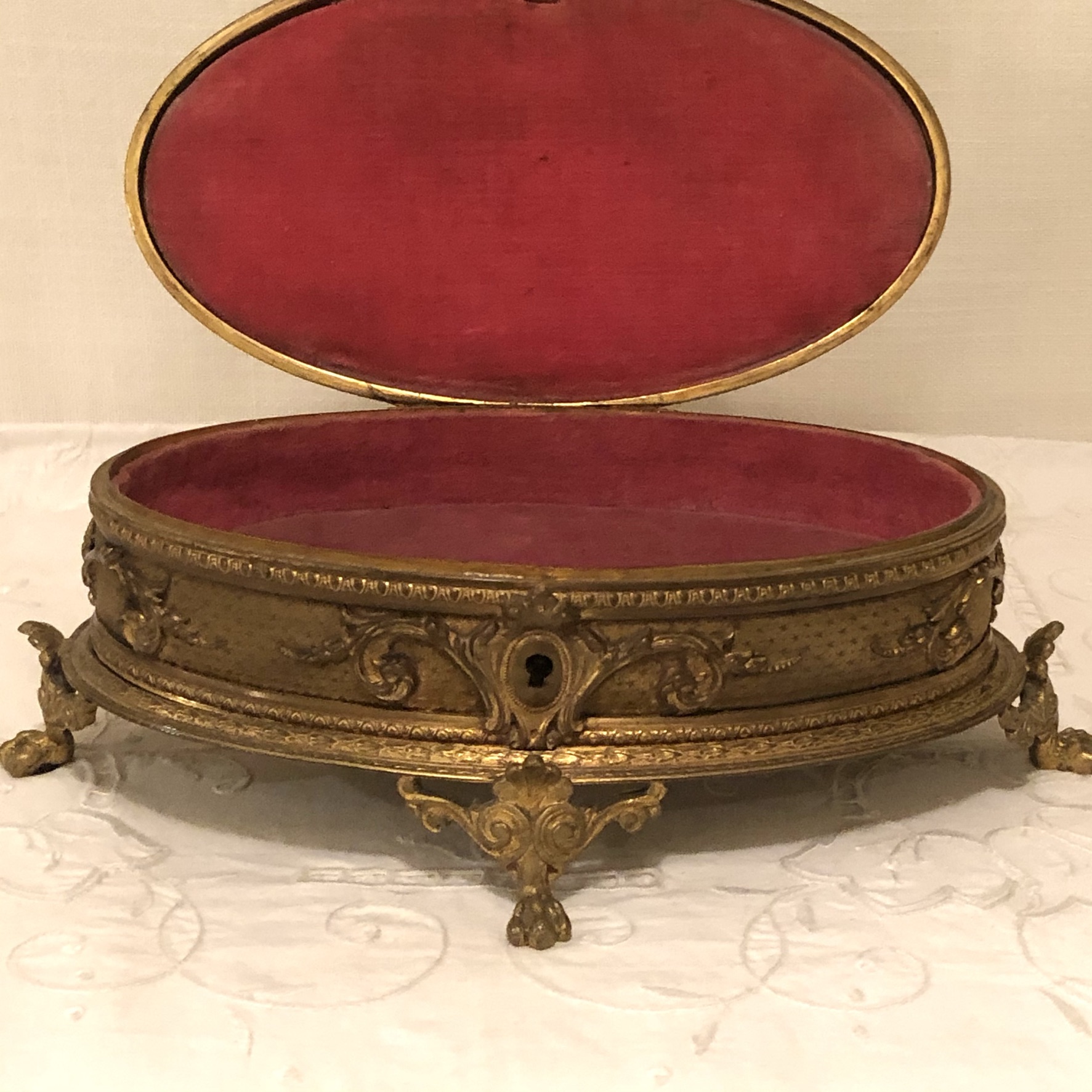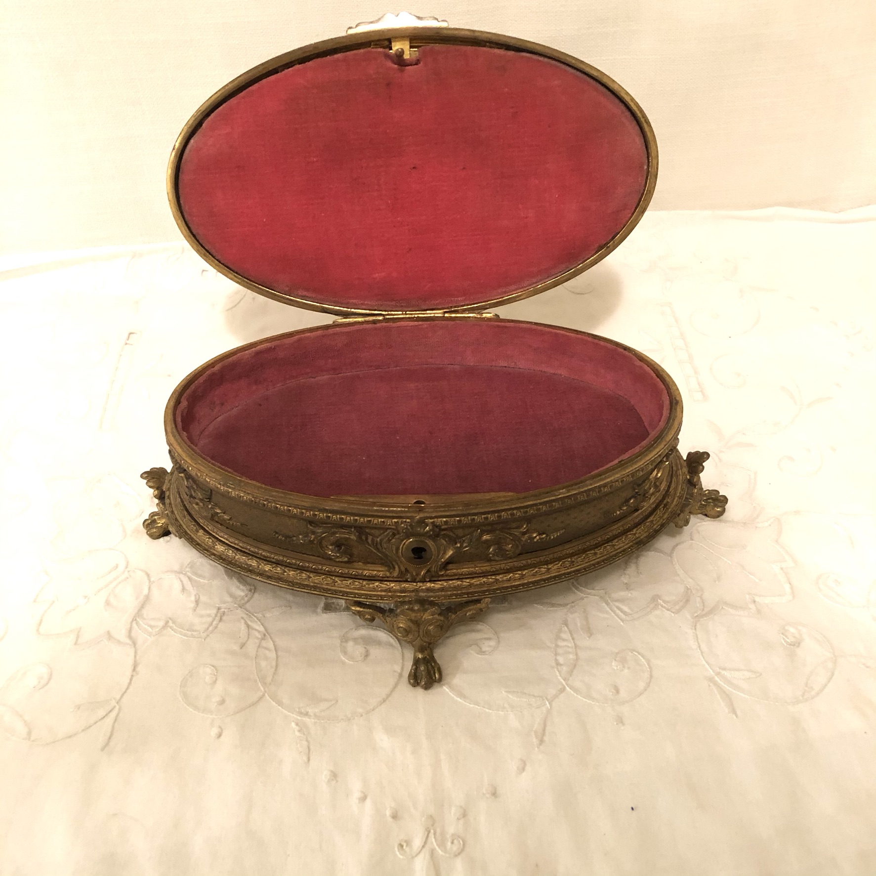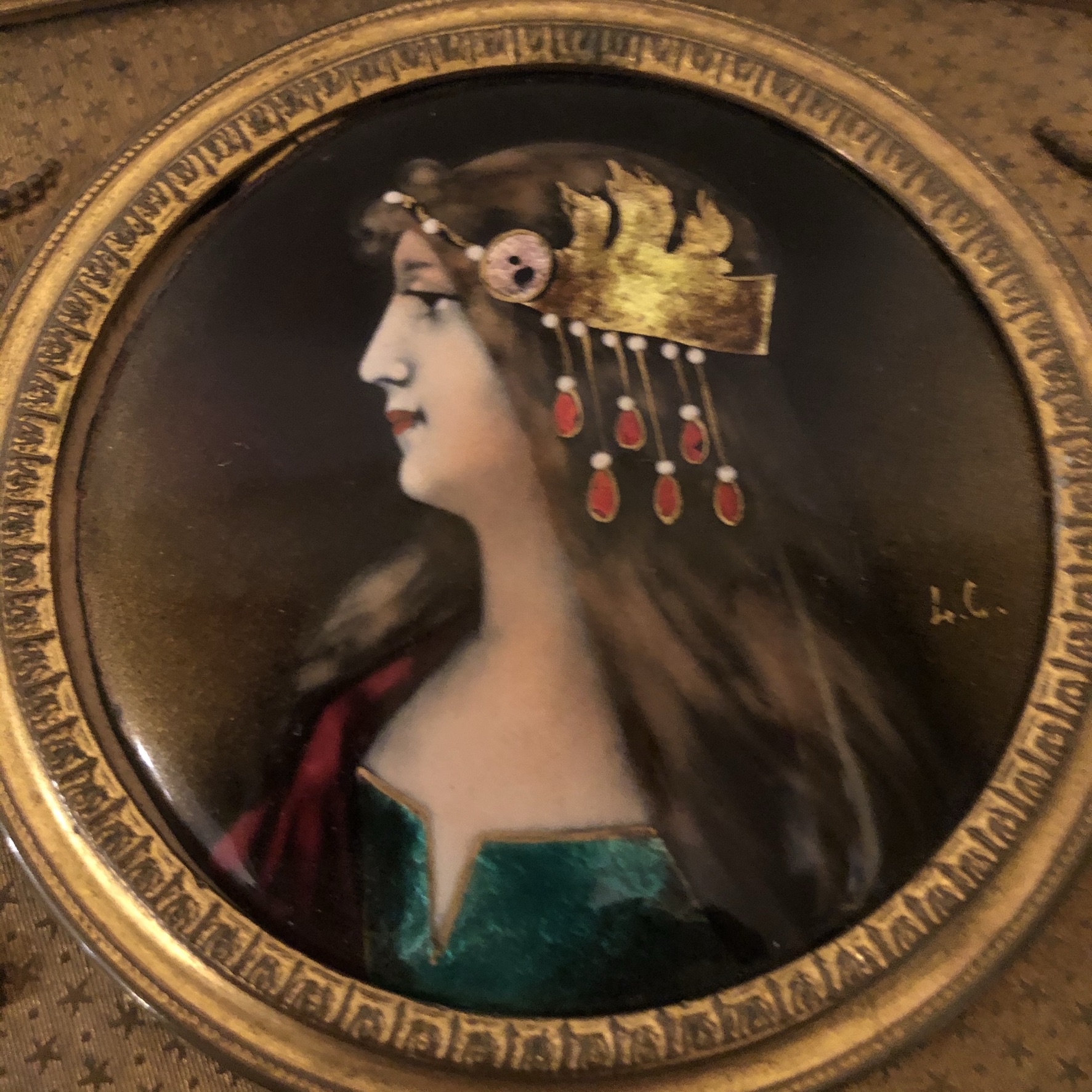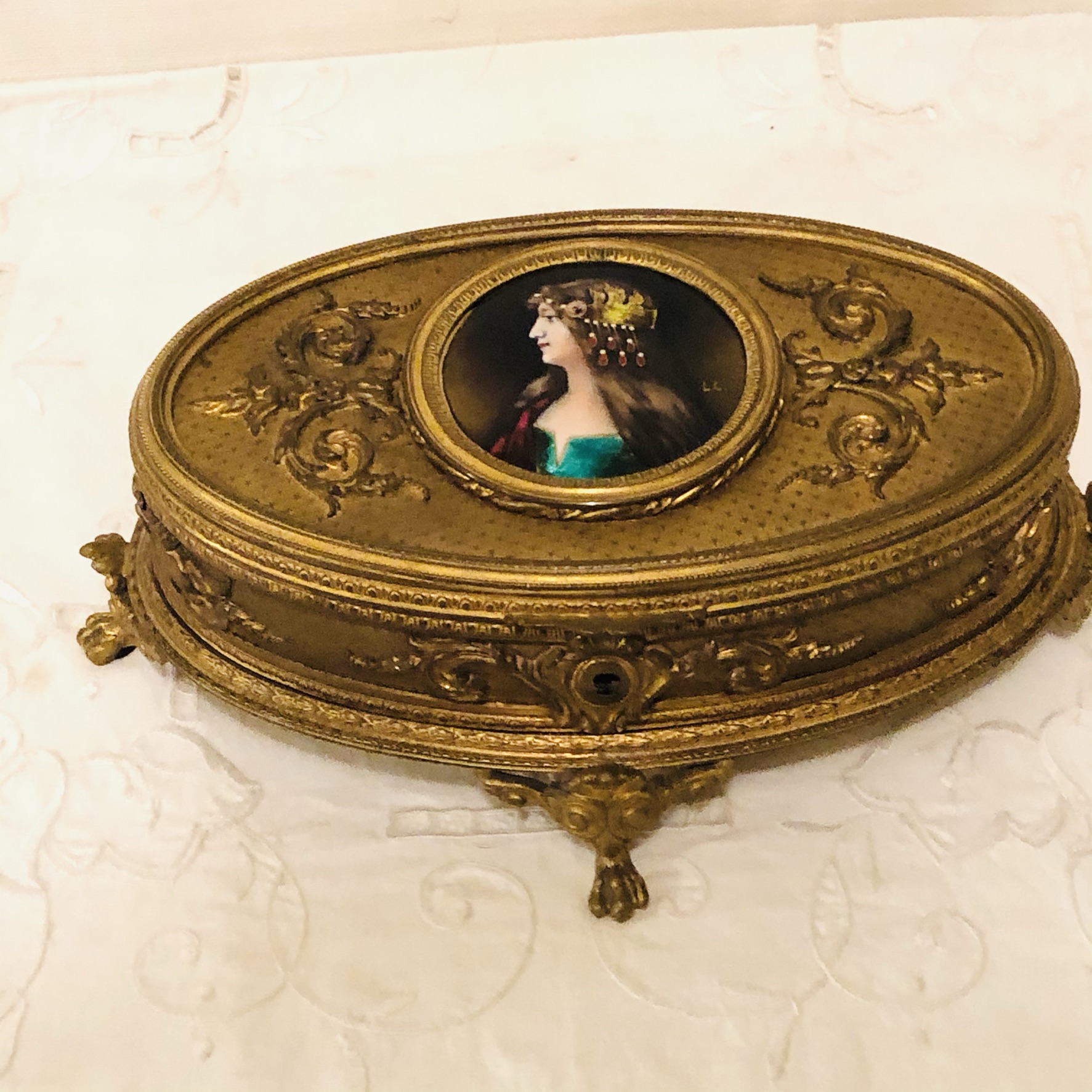 We are offering this French bronze box with an enamel portrait of a beautiful lady on four raised feet. The portrait is of a lady wearing an art deco hat and a green dress. This beautiful bronze and enamel box is artist signed L. C. The box has a rose velvet interior. It is from the late 19th century. It is 10.5 inches wide, 7 inches deep and 3.5 inches tall. It would the perfect jewelry box for your special jewelry pieces. It is also a stunning decoration for any table in your house.