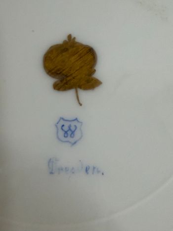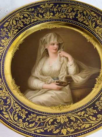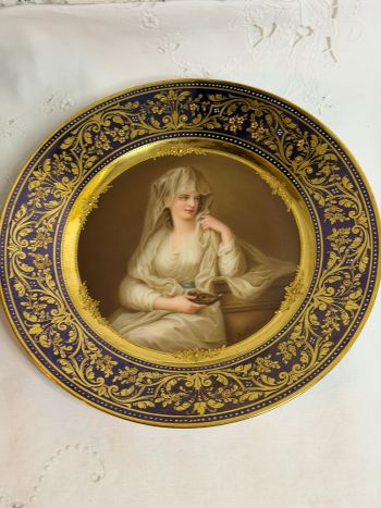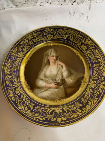 We are offering you this magnificent Dresden portrait plate with a central painting of a beautiful lady with a white veil and a white flowing and draping dress. This plate was made by the decorator Wiswall Dresden.  The border of this Dresden plate is cobalt with a gold trim with raised gold arabesque design. Around the painting of the lady is a cobalt background with a thick gold border with 6 gold raised flowers. It is 9.75 inches in diameter.