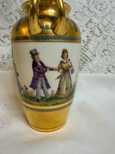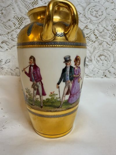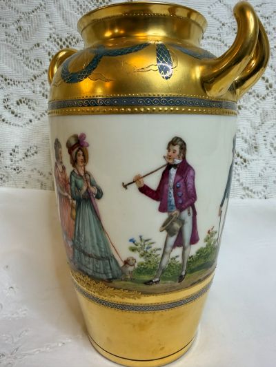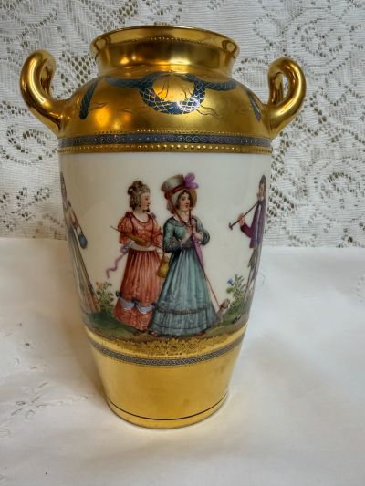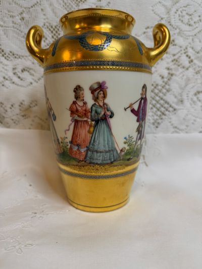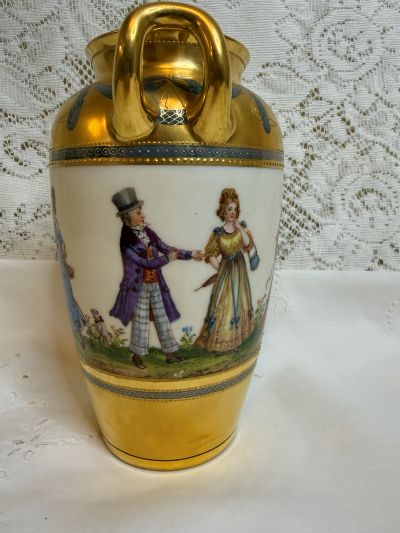 For sale is this amazing Wiswall Dresden vase hand-painted with scenes of ladies and gentlemen enjoying a beautiful day dressed in their finest 19th century clothing. The painting on the vase is a continuous painting around the whole vase showing a story. Some of the couples are dancing, others are walking arm in arm, and another lady is walking her dog. while talking to a gentleman with his cane and top hat. It is a lovely painting, bright and colorful showing the wonderful talents of the Dresden artist. There is a thick gold border that has gold jeweling and blue decorative accents on the top and bottom of the vase surrounding the painting. The handles of the vase are also gilded. This fabulous vase was made by the decorators of Wiswall Dresden in Germany during the early twentieth century. It is 8.25 inches tall and 6 inches wide. This vase would be a fabulous addition to any porcelain collection or a wonderful decoration in your home with or without flowers. Since it is painted on all four sides, it would be stunning anywhere you choose to place it in any room.