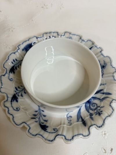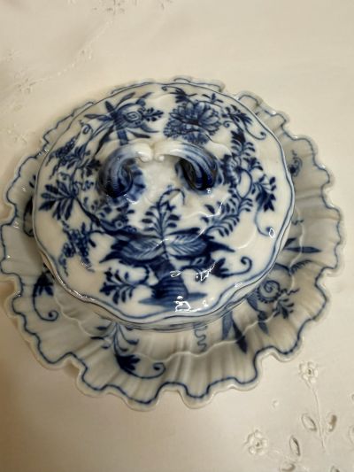 We are offering you this rare Meissen blue onion covered butter or cheese dish. It has a fabulous, fluted border. This Meissen piece is from before 1890. It also has a pretty handle to lift up the top. Its diameter is 8 1/2 inches and its height is 4 3/4 inches. This is a one-of-a-kind Meissen piece. It is in very good condition.