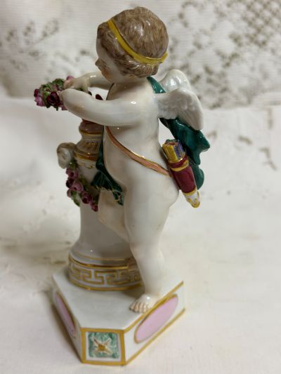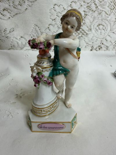 I want to offer you this Meissen cherub figure, who is holding two hearts together on a pedestal, as well as a halo of flowers in his hand. The pedestal has rams’ heads and garlands of flowers on it. The cupid has arrows in his sheath. The figurine is entitled “je les couronne”. This figurine is modeled so beautifully that you can see every hair strand and every finger and toenail. This figure is in very good antique condition, without any chips, cracks or repairs.