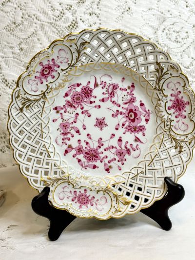 I want to offer you this fabulous purple Indian Meissen reticulated plate. It has detailed paintings of pink flowers with some purple and gold accents on a white ground. The detail of the painting on this reticulated plate is beautifully done. It has a gold border. Inside the gold border are three cartouches of pink Indian flowers with gold borders All the reticulation is surrounded by gold edges. This is one of my favorite Meissen patterns. It is definitely eye catching and would make a stunning addition to any table setting. The pink tones of the pattern are not only beautiful and intricate, but they give a bright and cheerful feeling to any dinner service. The diameter of this plate is 9.25 inches.
