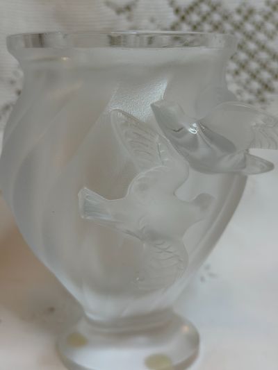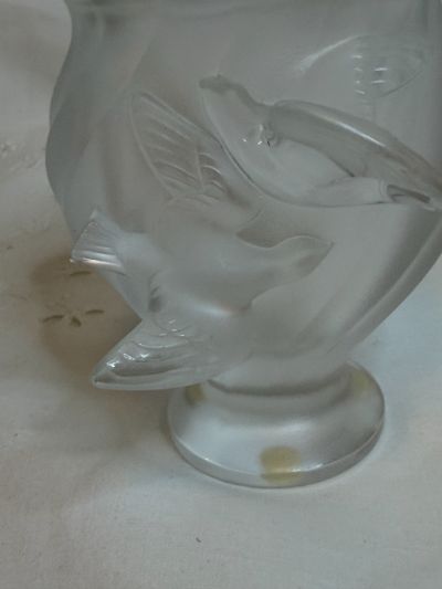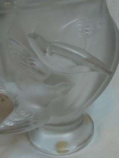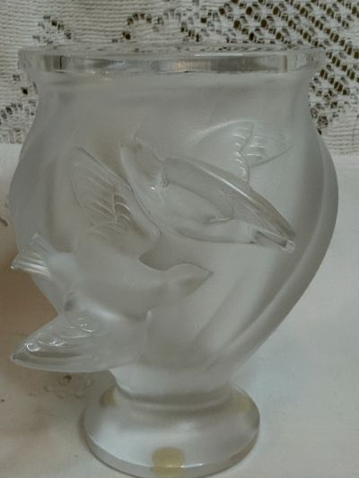We are offering you this iridescent Lalique vase that has two raised birds that look like they are in flight. It is signed Lalique France. This vase is 5 inches tall and 4 inches wide.