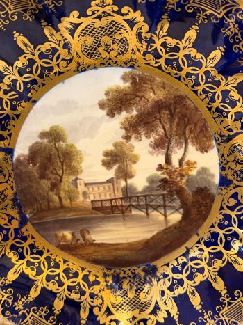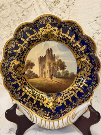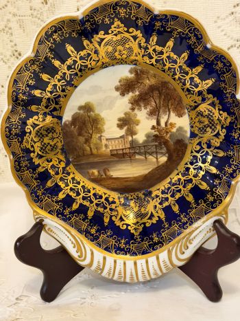 We are offering you this fabulous pair of cobalt Spode hand-painted scenic bowls with fluted borders. One bowl is entitled Euston Hall and the other is a scene of a couple walking to a building. One of the pair has the red Spode mark on its back. The red Spode mark denotes the bowl is from the 1830s. If you look at the paintings on these bowls, you can tell they were painted by a very talented artist. There is a thick cobalt border around the paintings with gold decoration, which makes the paintings even more stunning. The bowls are scalloped shaped with a handle.