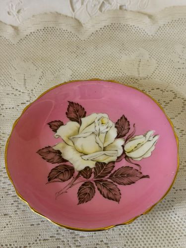 We are offering you this highly collectible pink English Paragon cup and saucer. It has a white cabbage rose on the inside of the cup and also on the saucer. It is called a double Paragon cup as it has double Paragon marks or warrants. They signify Queen Elizabeth 1 and Queen Mary. It was made between 1939-1949.
