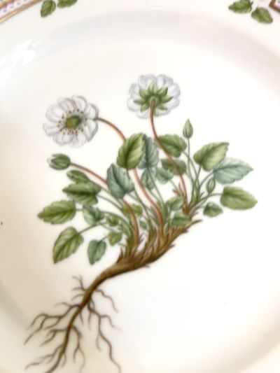 We are offering you this stunning Royal Copenhagen Flora Danica luncheon plate painted with white botanical flowers, made in 1966. The botanical name of the flowers is written on the back of the plate. It is 8.75 inches in diameter. Flora Danica is the most exquisite of all the porcelain made by the Royal Copenhagen Manufactory. Each Flora Danica plate has a hand-painted central painting of a botanical flower. Each border of every plate has an extensive intricate gilded serrated border unlike any other plate I have ever seen. Inside the border are paintings showing the flower’s early buds as they are growing. In 1790 the King of Denmark ordered the Royal Danish Porcelain Manufactory to make Flora Danica to be the most impressive porcelain in the world. The botanical flowers were taken from reference books that referenced all the flowers and flora in Denmark earlier that century.