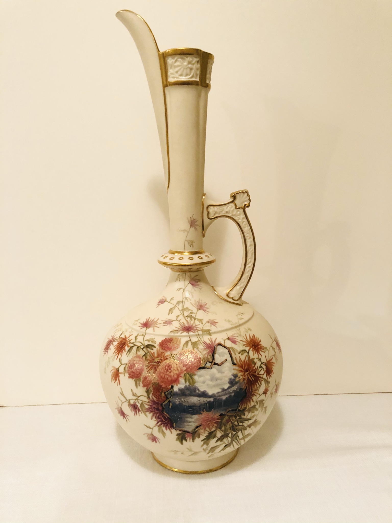 This tall Royal Worcester vase or ewer is hand-painted with a beautiful pastoral scene surrounded by gorgeous flower painting. If you look at the scene on the vase closely, you can actually see the sheep in the background. The handle and the border around the top of the vase have raised blush ivory tone porcelain decoration, as you can see in the pictures. This would be a stunning decoration for your home. This vase is 18.25 inches tall and was made in the year 1888.