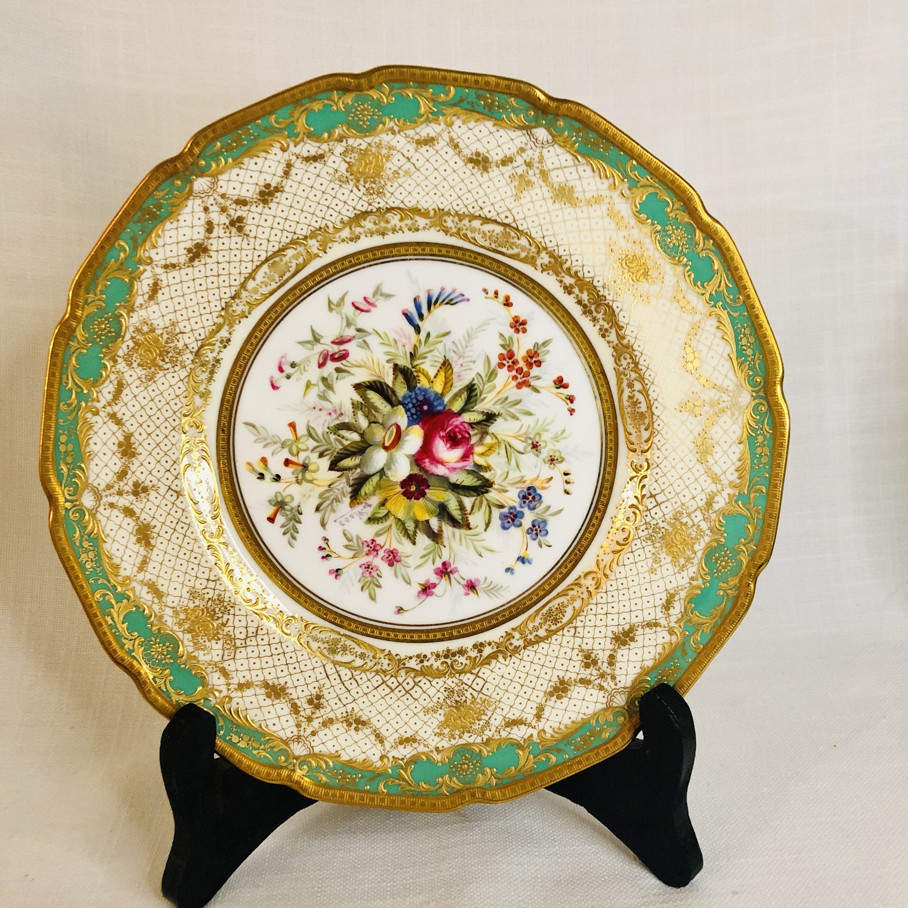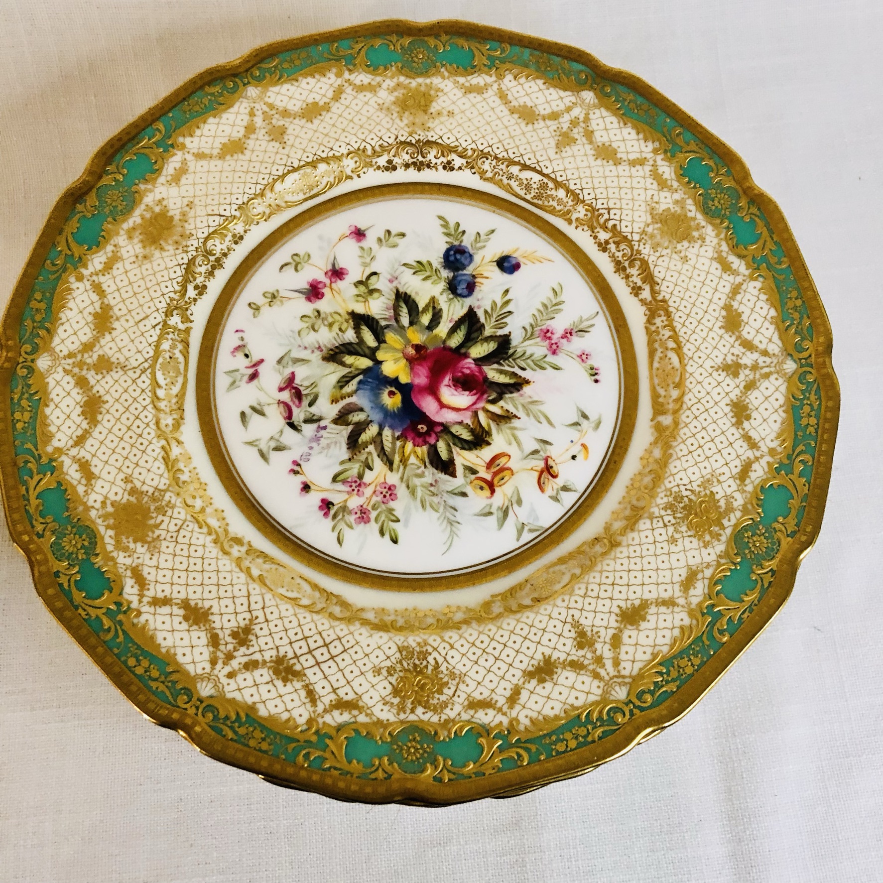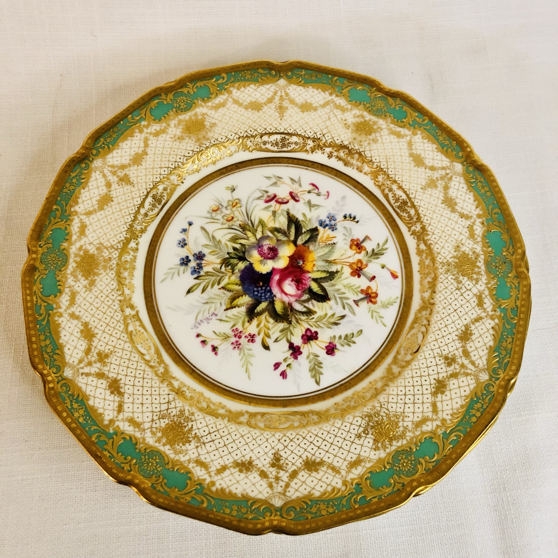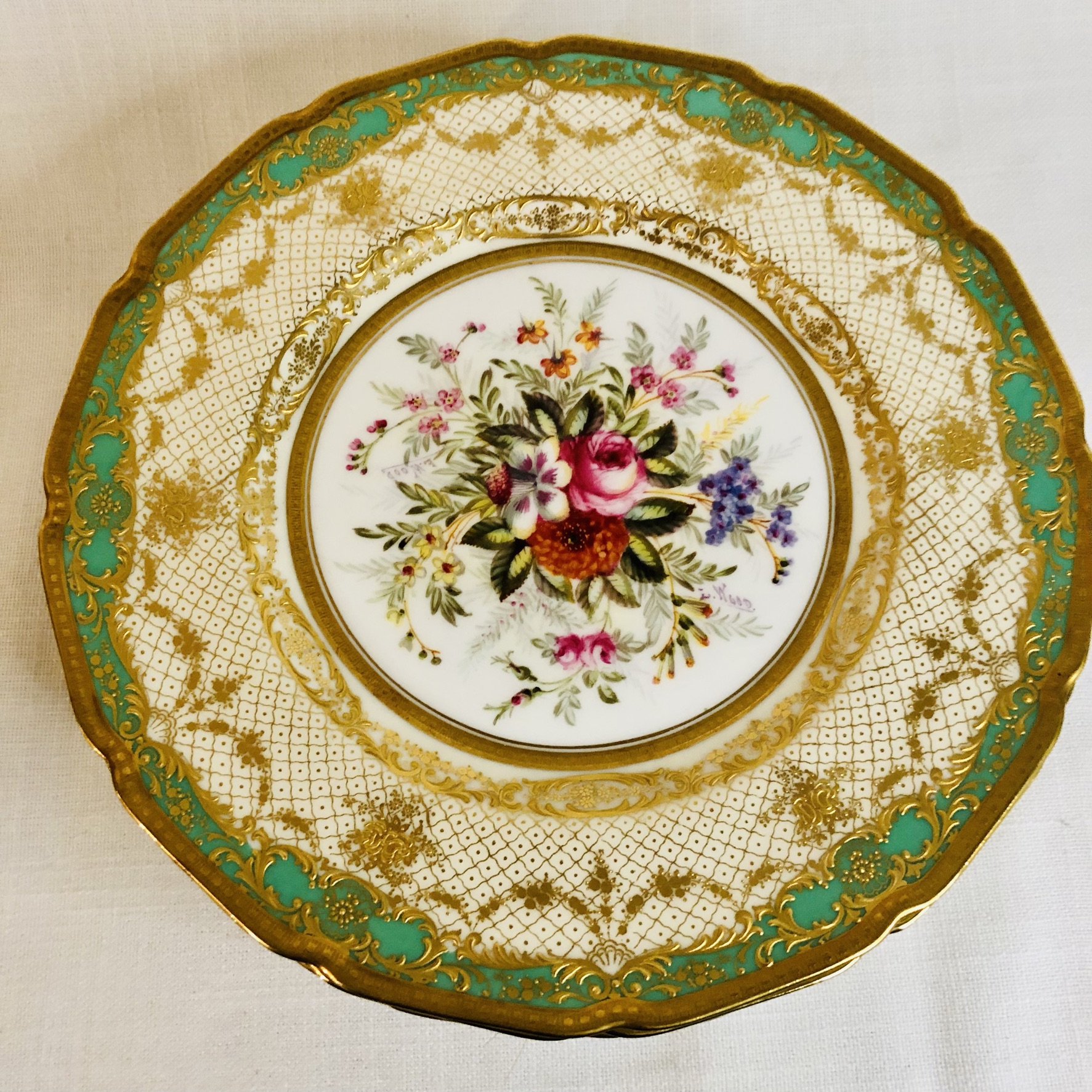 I am offering you this exquisite set of twelve Royal Doulton museum quality plates artist signed E. Wood. Each plate is painted beautifully with different bouquets of flowers with raised gilded ribbon accents around the inside of the green and gold fluted border. These plates are definitely rare breathtaking works of art. Please look at the pictures to see all the gorgeous bouquets of flowers. They were made in 1927. The diameter of the plate is 9 inches. This would be an absolutely fabulous addition to your fine dining dinner service. These would also be a stunning decoration for your special cabinet.