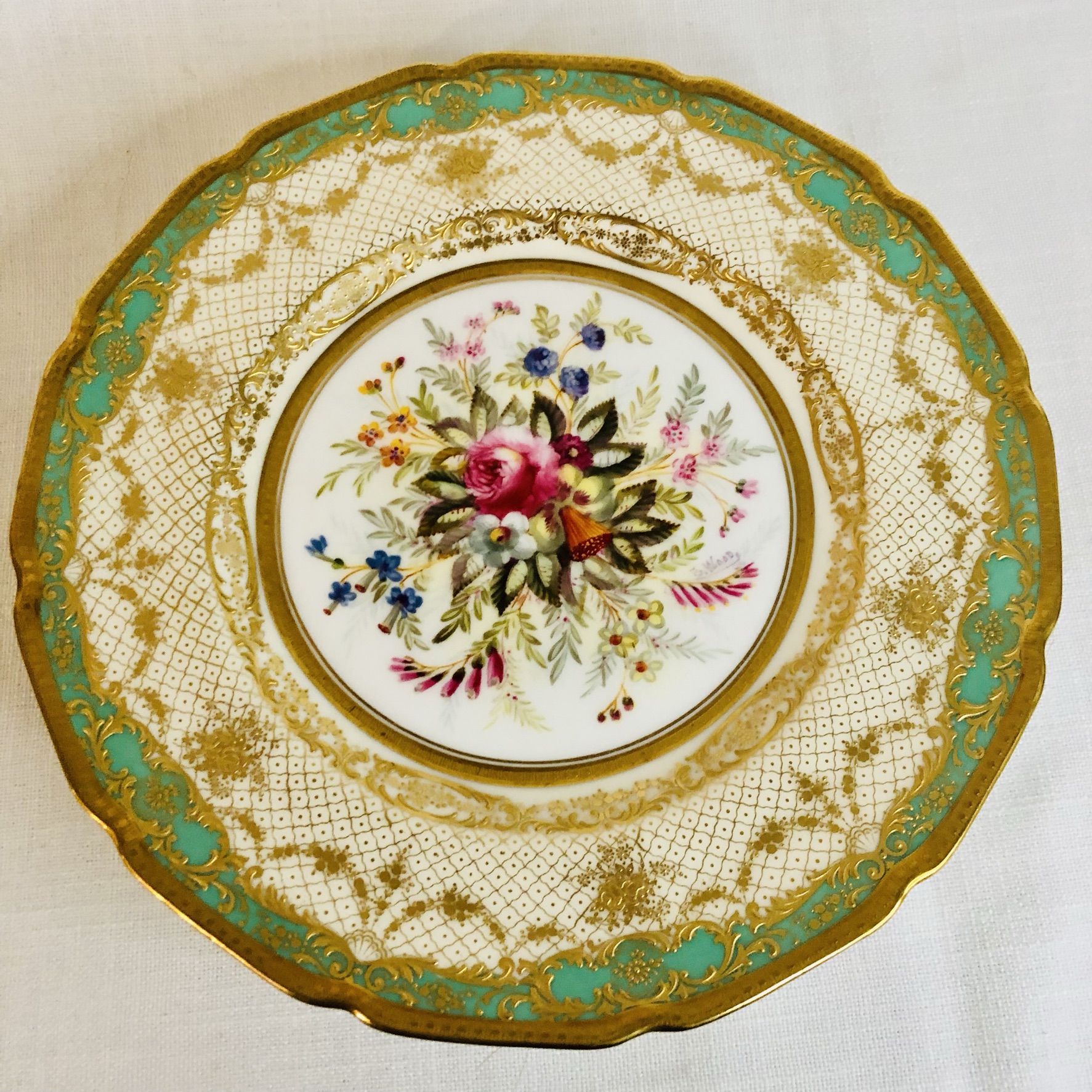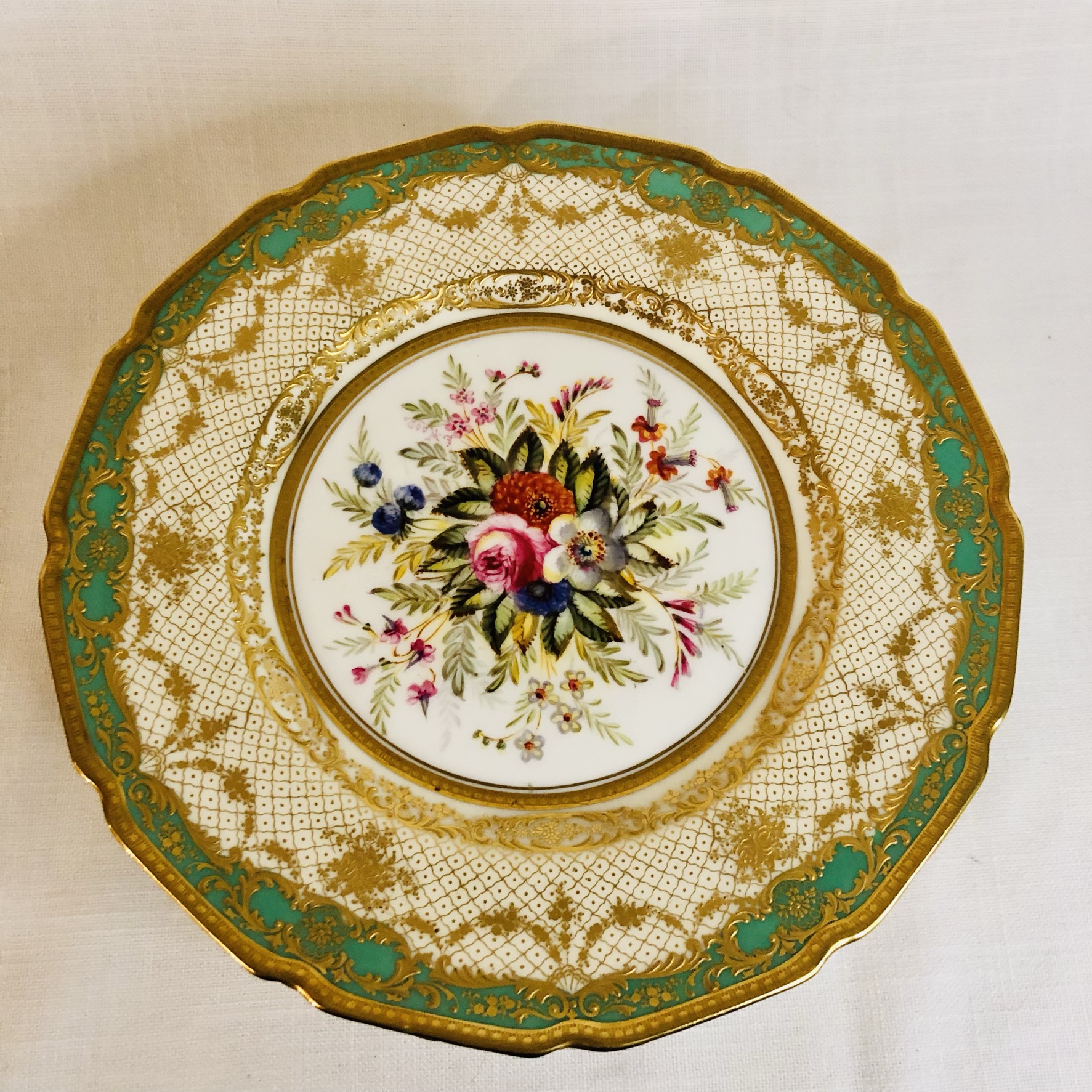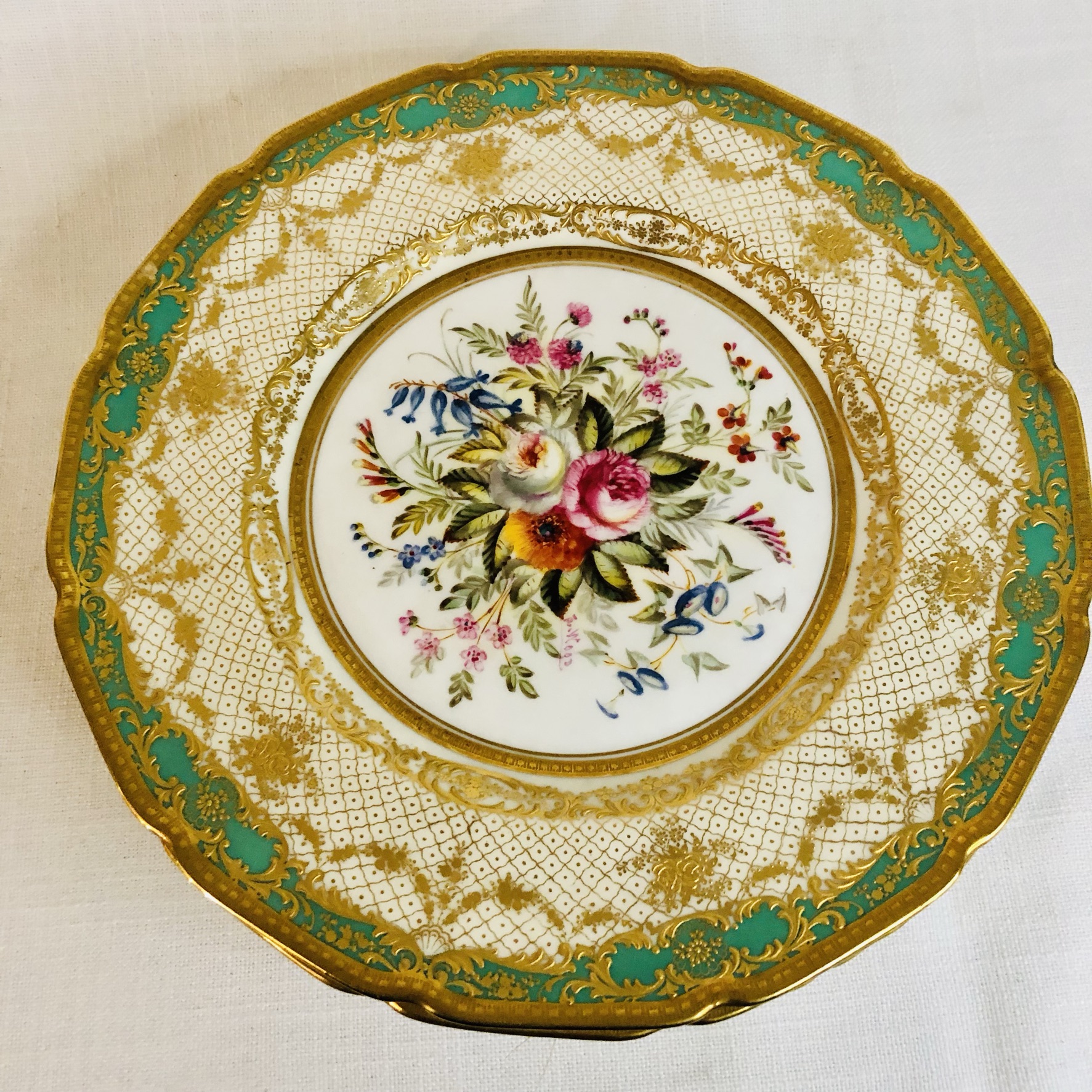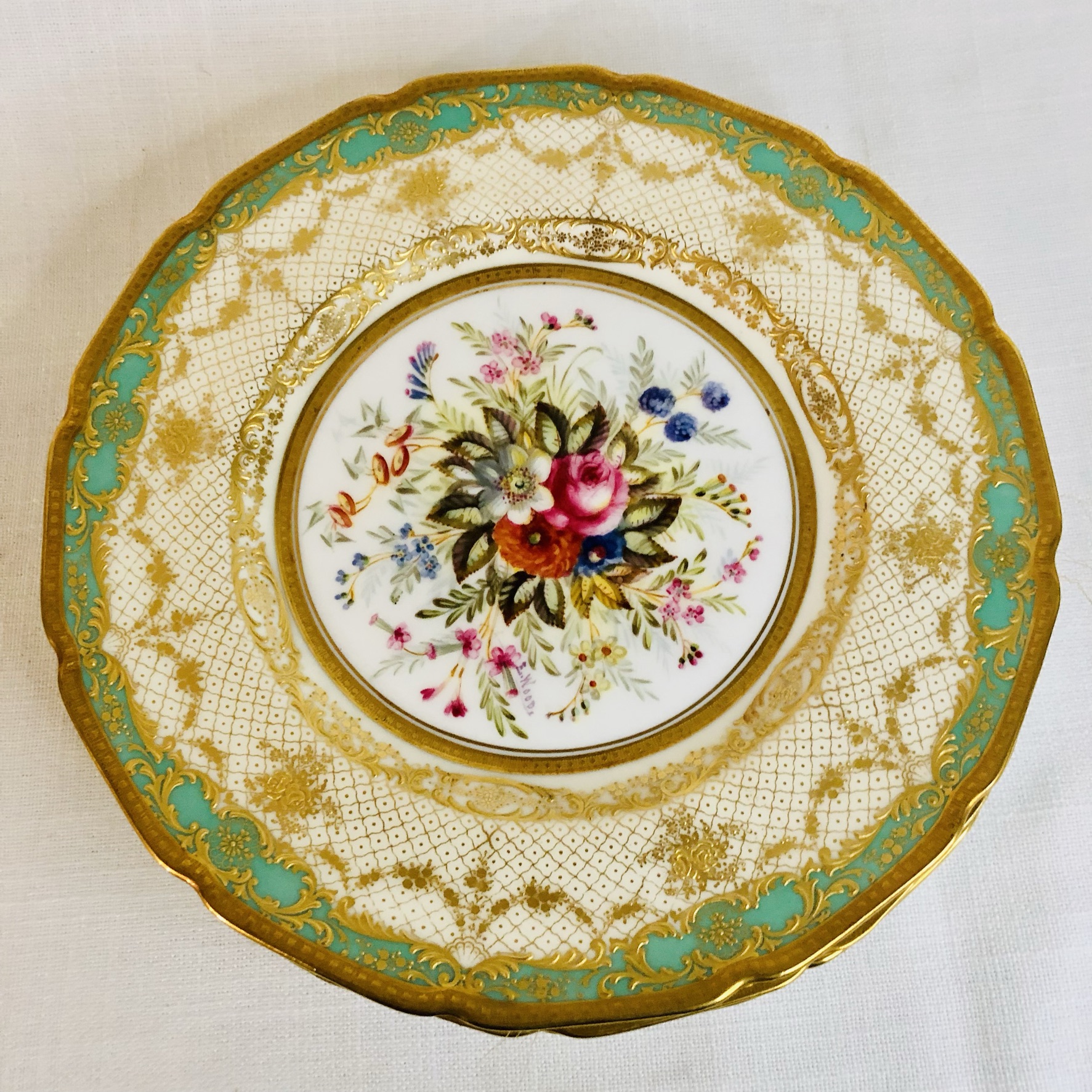 I am offering you this exquisite set of twelve Royal Doulton museum quality plates artist signed E. Wood. Each plate is painted beautifully with different bouquets of flowers with raised gilded ribbon accents around the inside of the green and gold fluted border. These plates are definitely rare breathtaking works of art. Please look at the pictures to see all the gorgeous bouquets of flowers. They were made in 1927. The diameter of the plate is 9 inches. This would be an absolutely fabulous addition to your fine dining dinner service. These would also be a stunning decoration for your special cabinet.