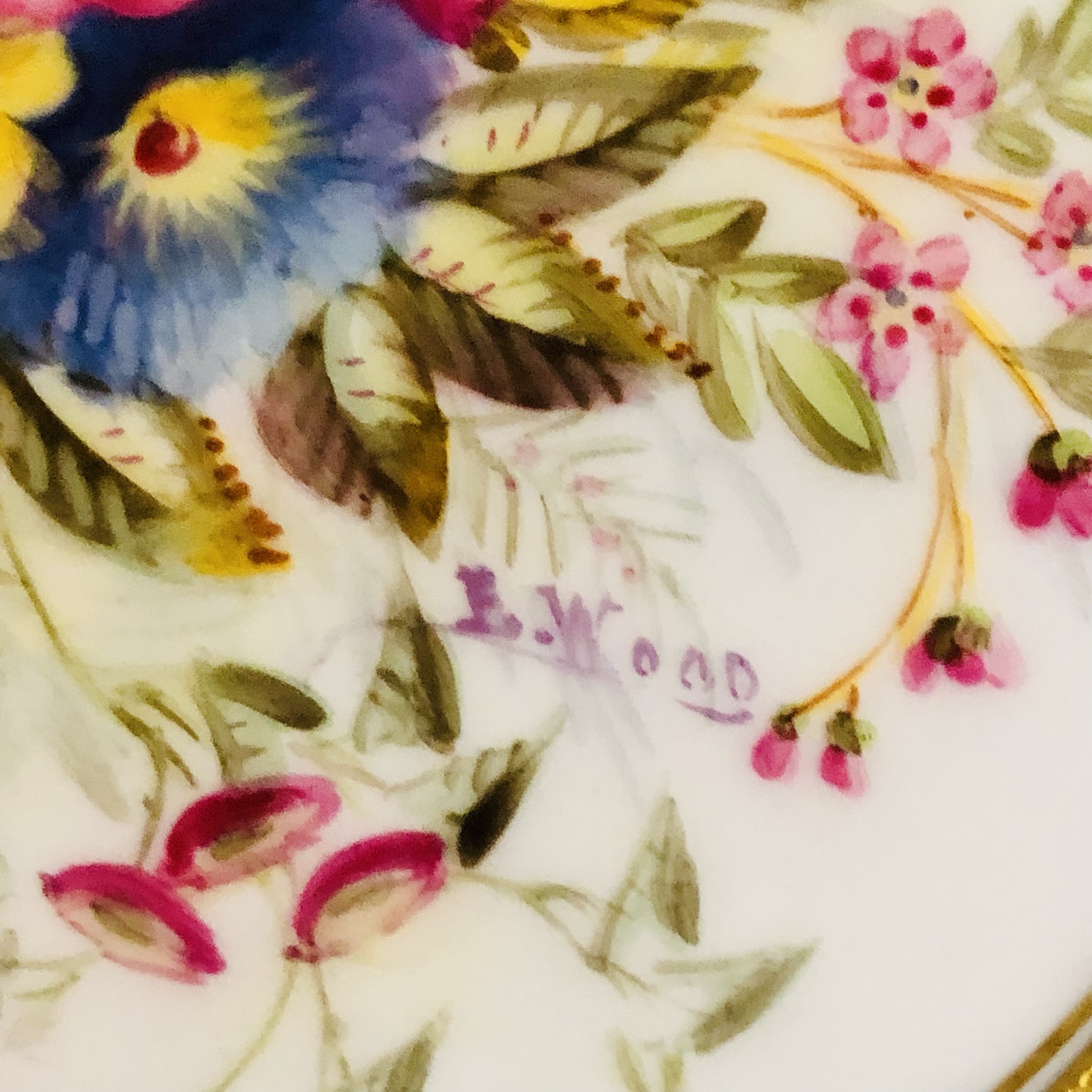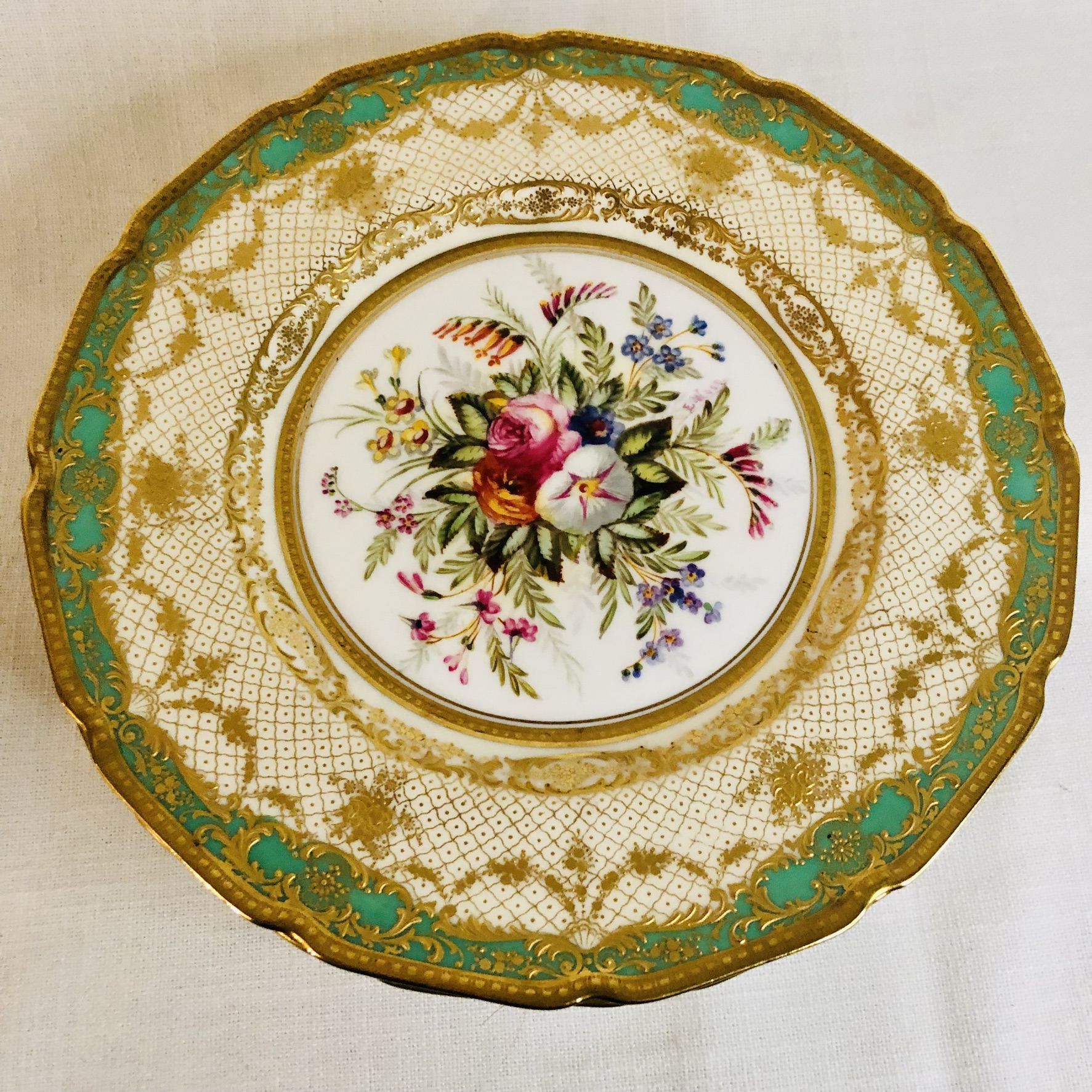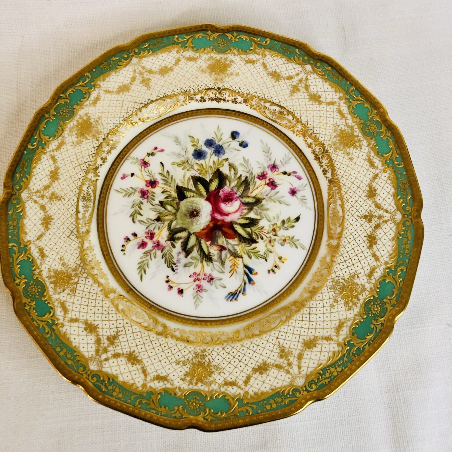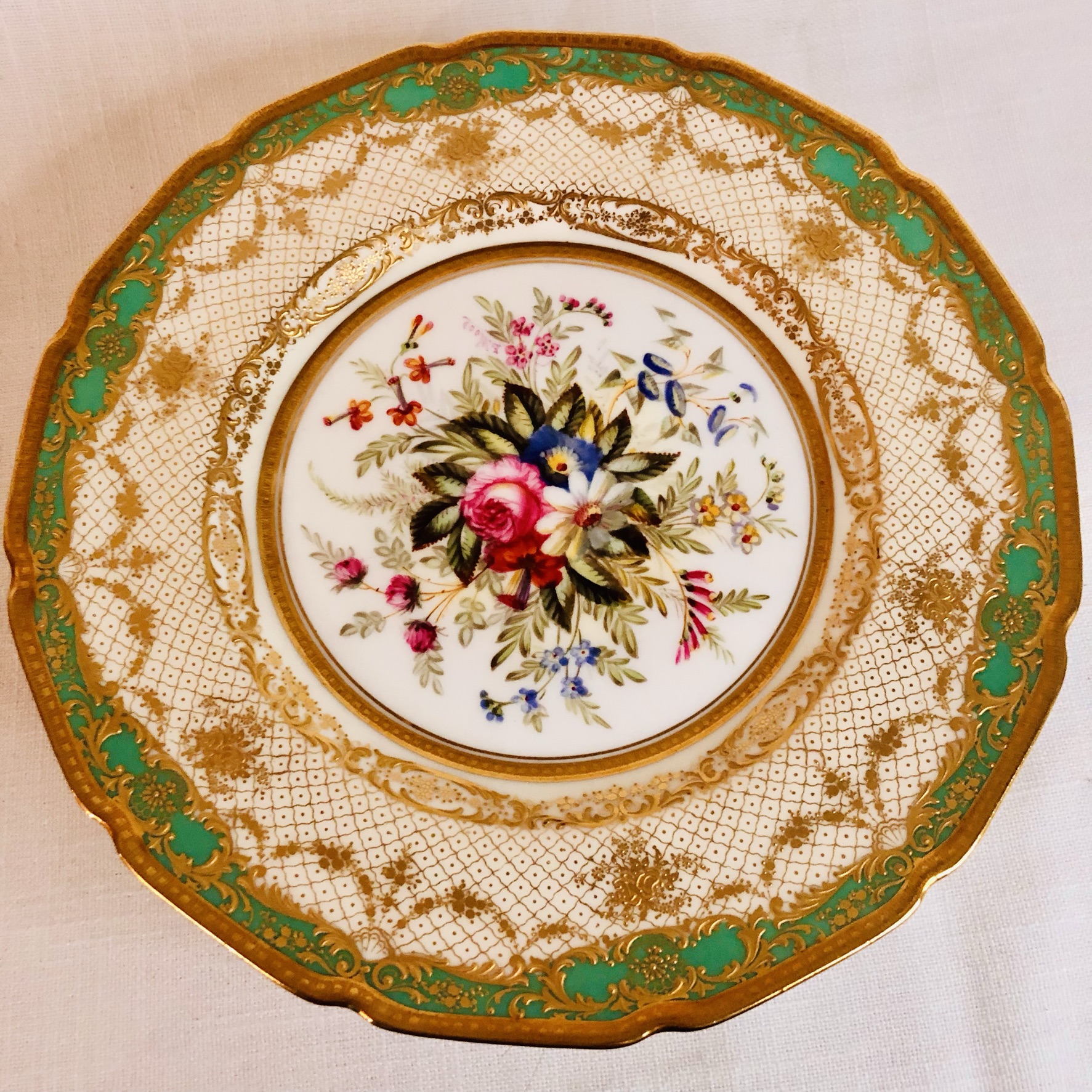 I am offering you this exquisite set of twelve Royal Doulton museum quality plates artist signed E. Wood. Each plate is painted beautifully with different bouquets of flowers with raised gilded ribbon accents around the inside of the green and gold fluted border. These plates are definitely rare breathtaking works of art. Please look at the pictures to see all the gorgeous bouquets of flowers. They were made in 1927. The diameter of the plate is 9 inches. This would be an absolutely fabulous addition to your fine dining dinner service. These would also be a stunning decoration for your special cabinet.