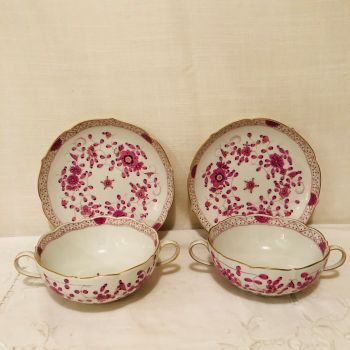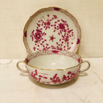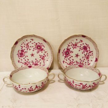 We are offering you this rare set of six Meissen purple Indian cream soup bowls and underplates. They are deep enough for your favorite soup. They would also be perfect for fruit cocktail or many ice-cream or mousse and custard desserts. They have detailed paintings of pink flowers with some purple and gold accents on a white ground. The detail of the painting on these Meissen cream soups is beautifully done. It has a gold border. The pink and gold tones of the pattern are not only beautiful and intricate, but they give a bright and cheerful feeling to any dinner service. This is one of my favorite Meissen patterns. It is definitely eye-catching and would make a stunning addition to any table setting.