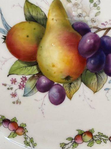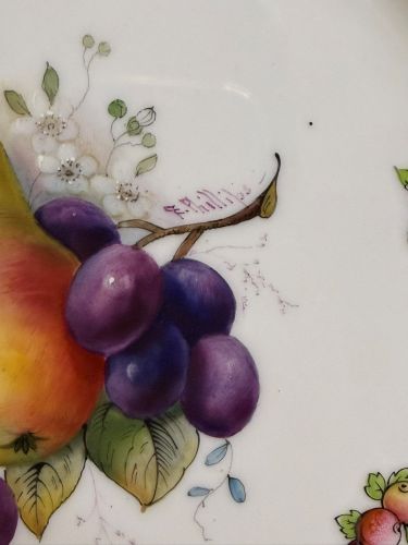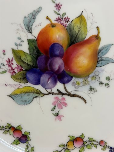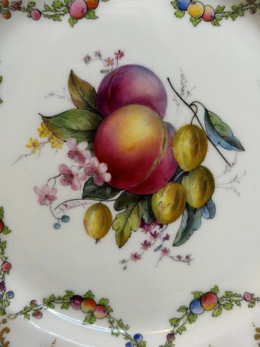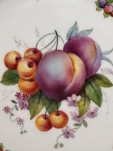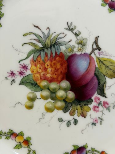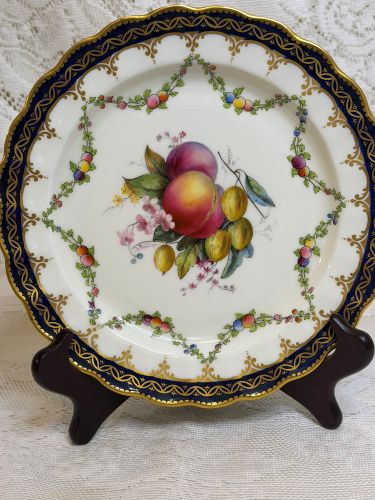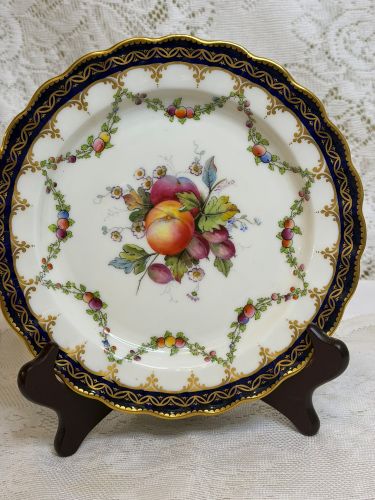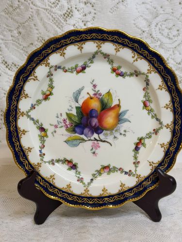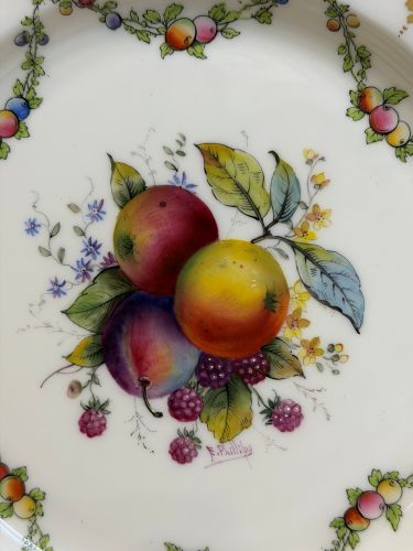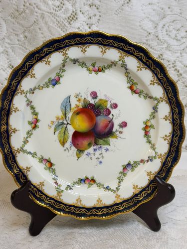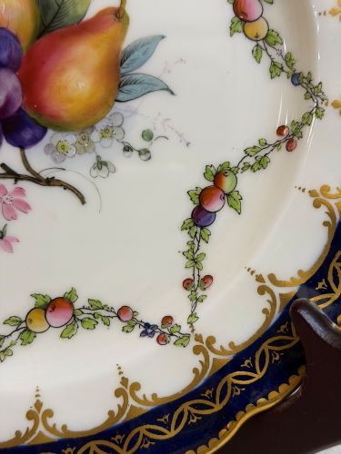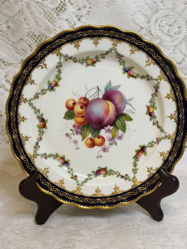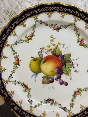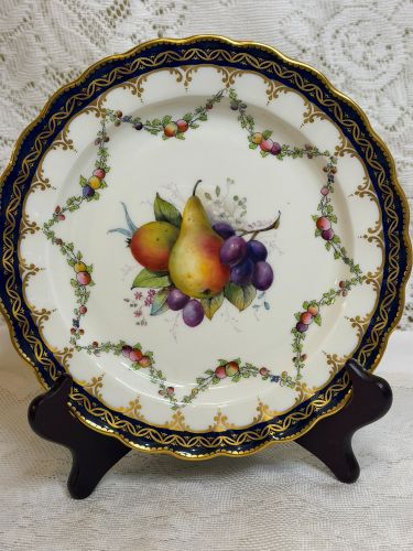 I want to offer you this set of ten Royal Worcester plates each hand-painted differently with magnificent museum quality fruit paintings. Each plate is artist signed by E. Phillips. He specialized in painting highly detailed floral and fruit paintings. Each of these plates are more beautiful than the next. The center of each plate has a large, beautiful painting of fruit. Around the fruit painting is a garland of fruits and leaves. There is a cobalt and gold fluted border that also has gold decoration on a cobalt background. These plates are definitely a feast for your eyes as Ernest Phillips was such a talented artist. They were made in 1923. They would be an elegant addition to any table setting or a lovely decoration on your wall or in your cabinet.