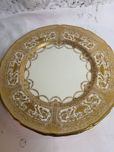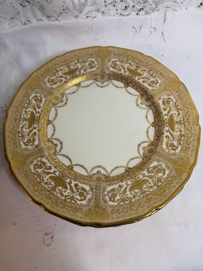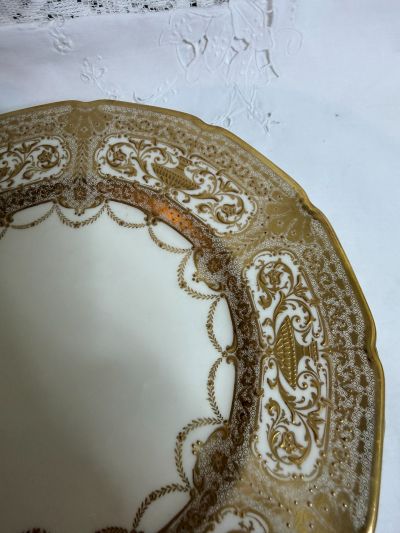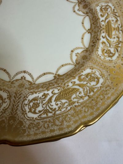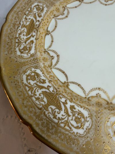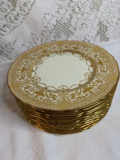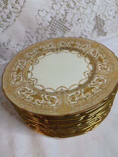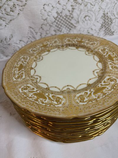 This is an exquisite set of twelve Royal Doulton dinner plates. These dinner plates have profuse raised gilding of urns and arabesque decoration on their white background. When you look at these plates, you can see the fabulous talent of the gilder who gilded these plates. In the 1920s when these were made, gilders spent their whole life perfecting their talent to apply gilding on plates. These Royal Doulton dinner plates would make a stunning addition to your elegant table setting. These plates are in excellent antique condition.