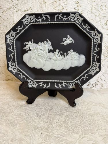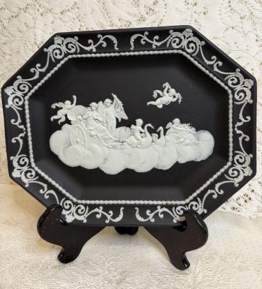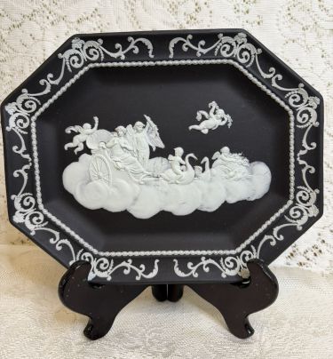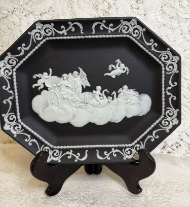 We are presenting you with this outstanding Wedgwood jasperware plaque for sale. It is a wonderful depiction of a beautiful lady and cherubs in a chariot pulled by swans above the clouds. There are cherubs leading the way for the chariot to follow. It is a wonderful artistic presentation. It would be a wonderful addition to your Wedgwood collection or a stunning decoration on your wall or in your cabinet.