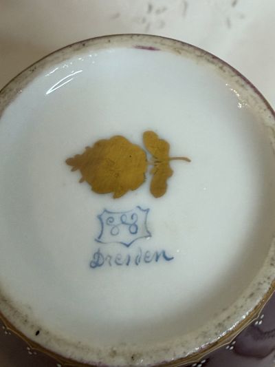 We are offering this fabulous Wiswall Dresden vase hand-painted with children playing and frolicking outside. Some of the children are fishing, another boy is playing a flute to a rabbit, others are playing blind man’s bluff, another boy is playing a tambourine while the angel is painting. The vase is maroon-colored on the top and bottom with raised gold decoration and white jeweling. The painting of the children is flanked with gold embossed borders with raised flowers on both the top and the bottom of the panoramic painting of the children. This vase is 6.75 inches tall and 4.25 inches wide. It was made between 1890s-1900. The vase is in very good antique condition. Please note the white small circle on the pictures is just a shadow from the light, not an imperfection. It would be a wonderful addition to any porcelain collection. This Dresden vase would be lovely in any cabinet or on any table.